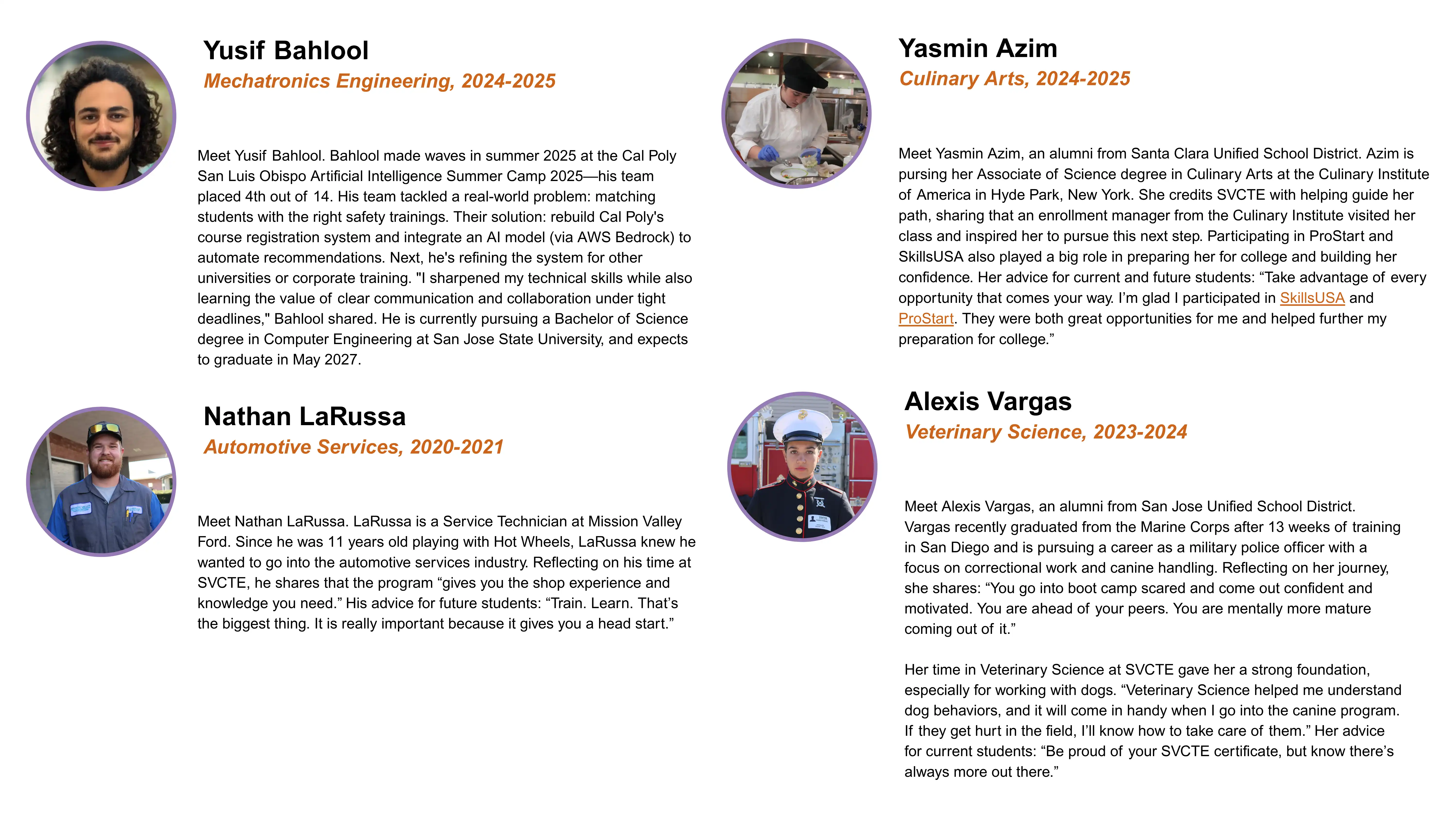 Here, we celebrate the journeys of our former students sharing updates on their accomplishments and highlighting how they applied the skills and experiences gained at Silicon Valley Career Technical Education (SVCTE) center into their college, careers, and beyond.