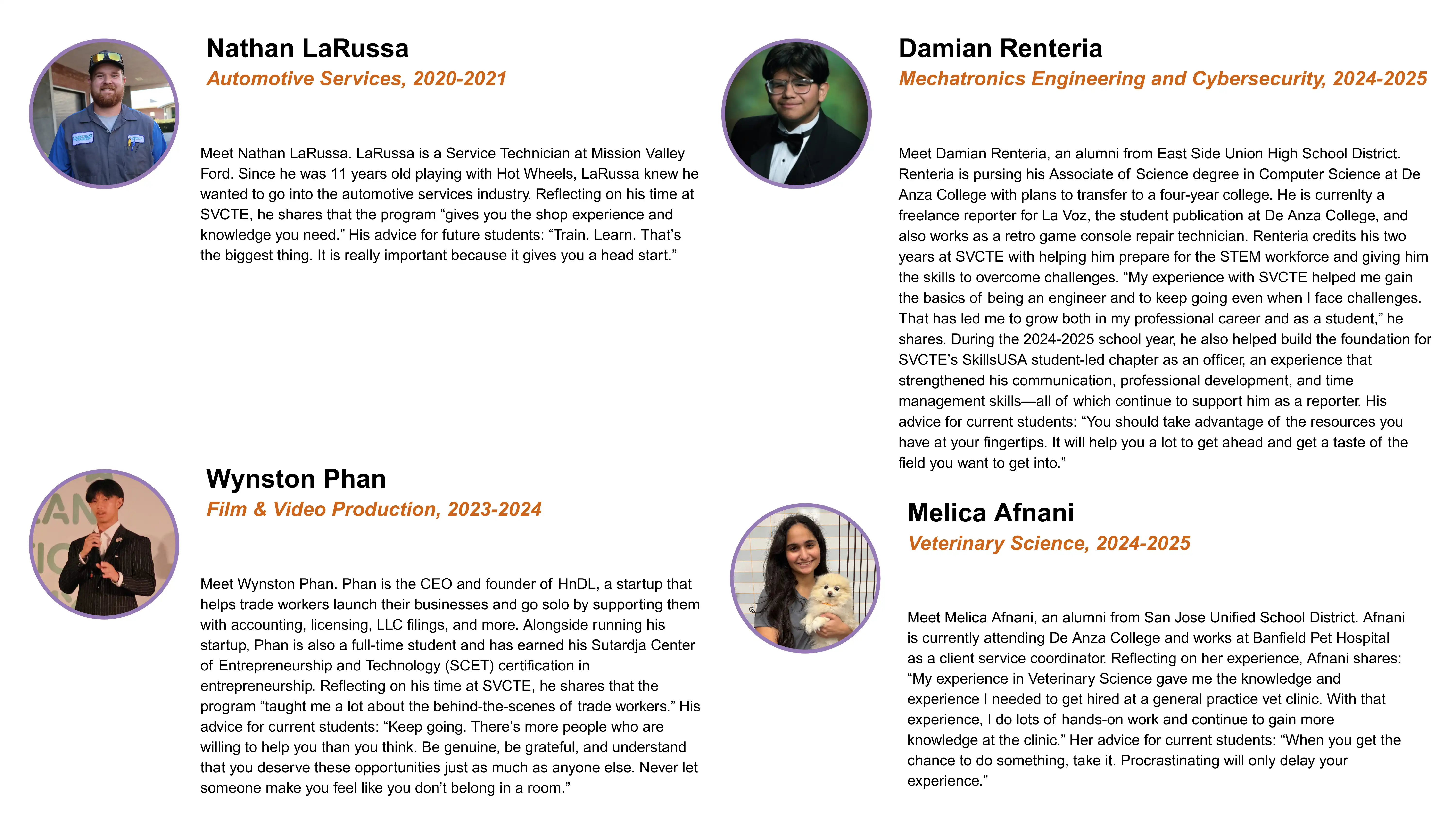 Here, we celebrate the journeys of our former students sharing updates on their accomplishments and highlighting how they applied the skills and experiences gained at Silicon Valley Career Technical Education (SVCTE) center into their college, careers, and beyond.